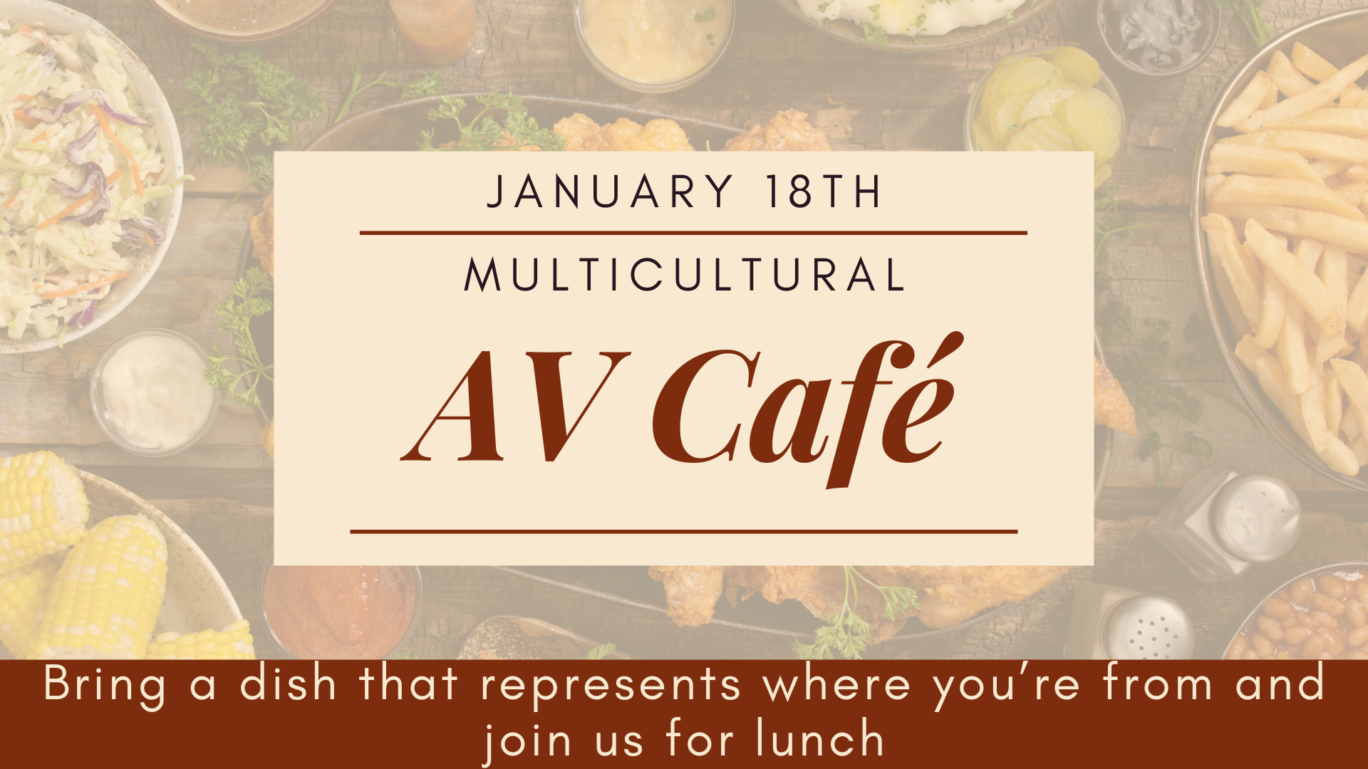Join us on Saturday, January 18, for our AV Café! This will be a multicultural gathering. Bring a favorite dish from home that represents where you’re from. Come enjoy great food, fellowship, and time together as a community!